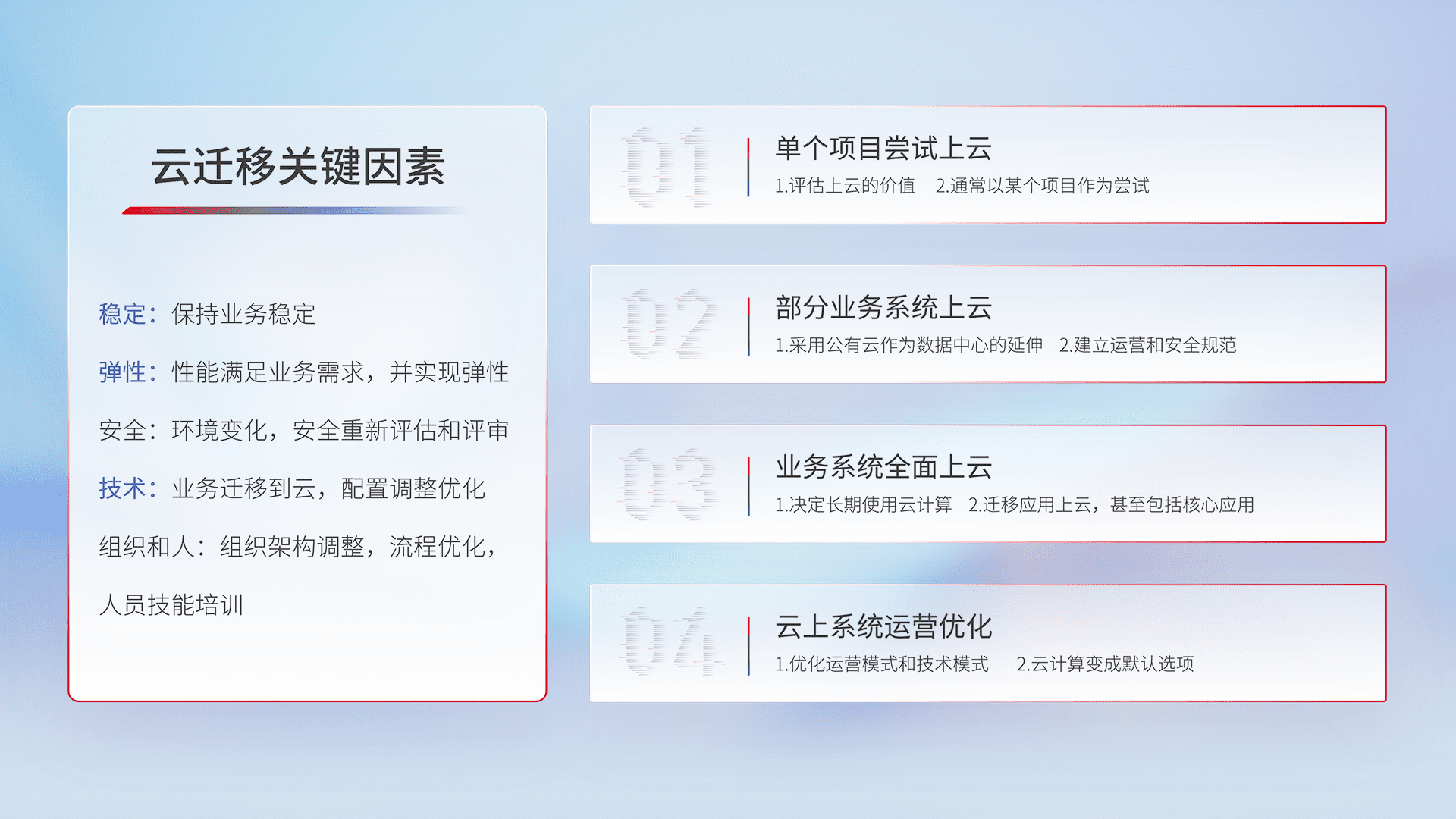结合实际业务,,从规划设计、、云平台选型、、、、云原生改造、、数据迁移、、、集成交付,,,迁移全过程为客户识别最佳上云路径,,做好风险识别管理,,设计网络架构、、、身份权限、、、、安全审计合规、、、、操作审计、、、日志审计、、、、监控告警策略、、、、多站点容灾设计等,,对云上基础设施进行整体规划,,提升IT治理水平,,,以满足弹性、、、、高可用、、高性能的需求。。