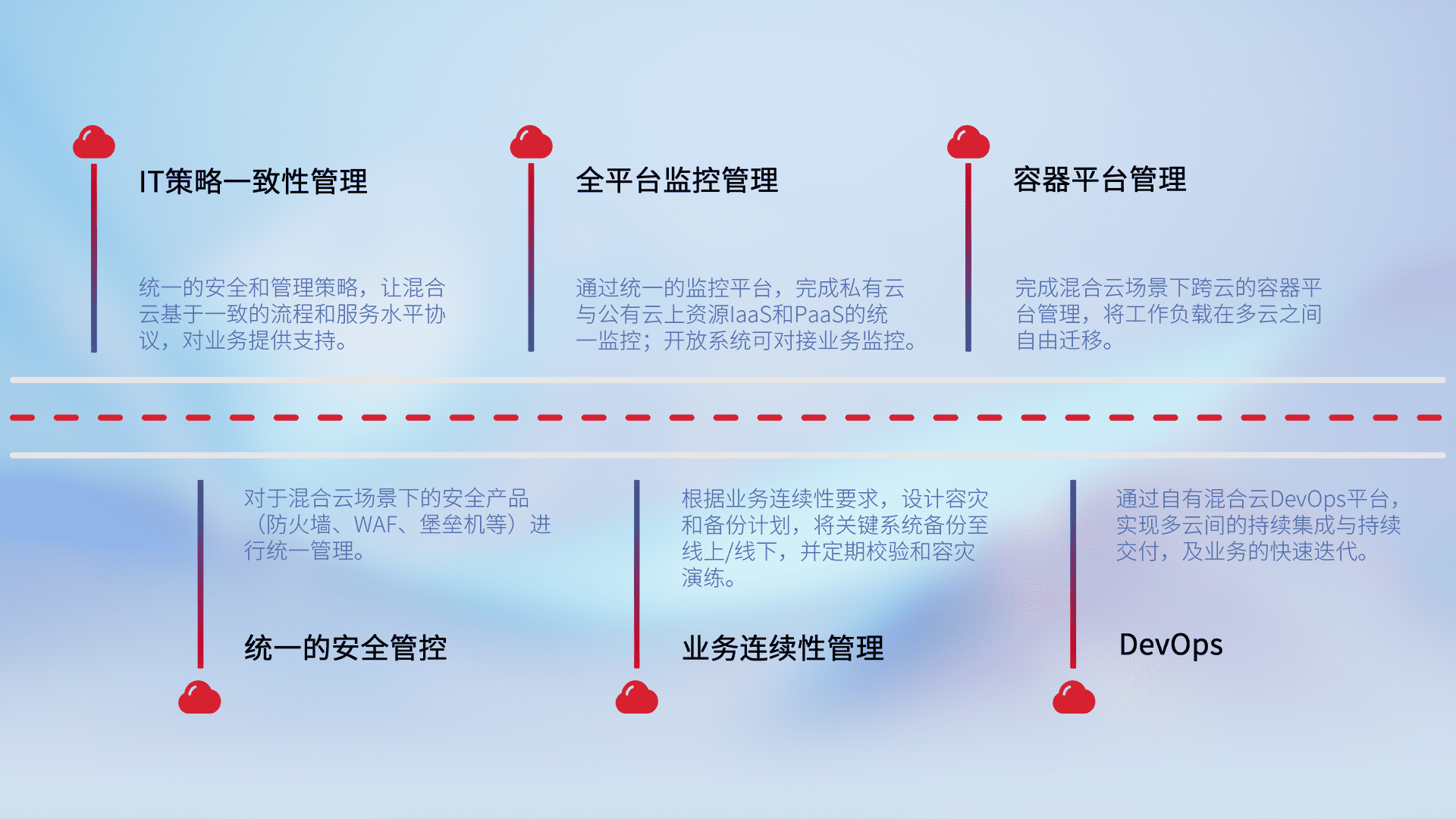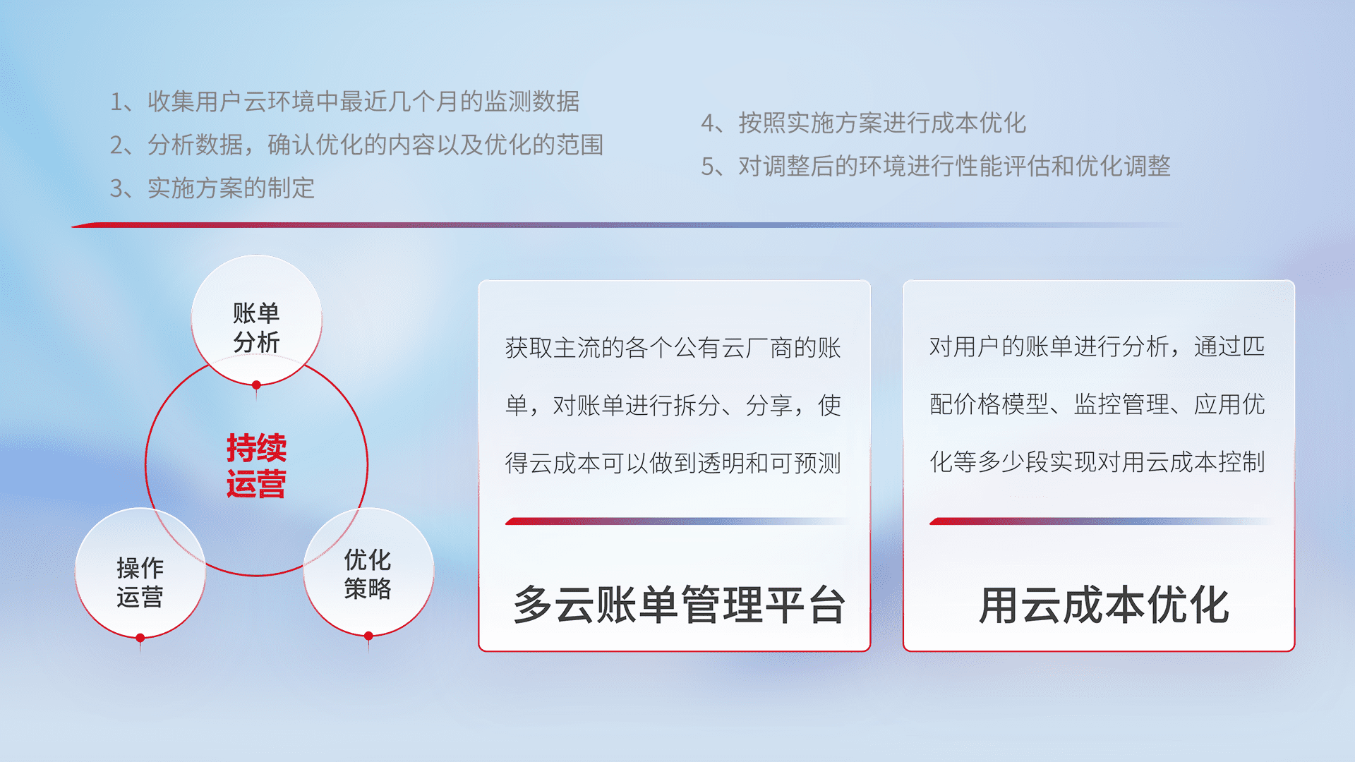 通过多云纳管,,,,以统一的资源数据模型把客户的云资源进行抽象和封装,,,,进而实现对多云资源的统一操作,,,保障云资源管理的可靠性、、稳定性与可用性。。量身定制化运维内容,,,配置、、、、开发运维、、、、补丁管理、、、备份、、、、监控、、认证和访问管理、、、审计和日常巡检等,,,保障在用云过程中的可靠度,,,稳定度以及高可用率。。。