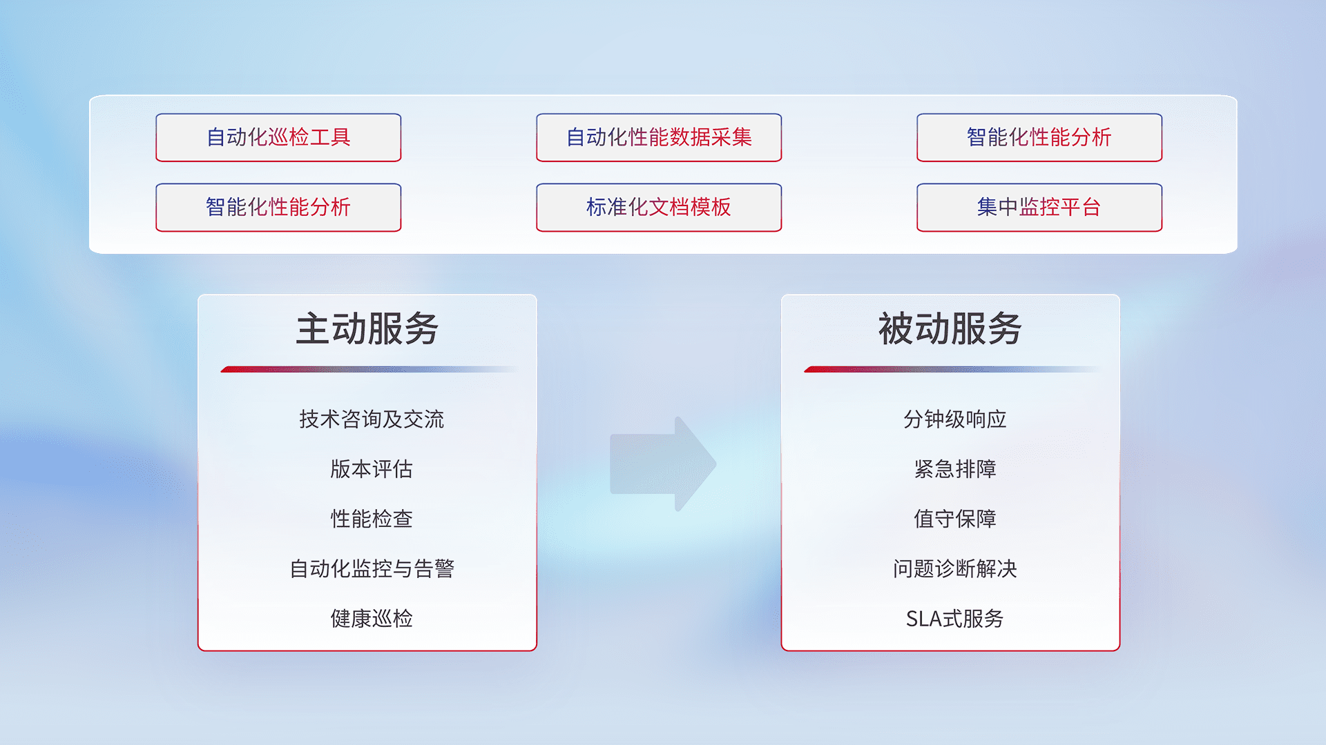 智能化工具和标准化文档,,,,保障服务质量,,提供主动服务(包含技术咨询、、、版本评估、、、、性能检查、、自动化监控与告警、、、、健康巡检)和被动服务包含(分钟级响应、、、紧急排障、、、值守保障、、问题诊断解决、、、SLA服务)。。。