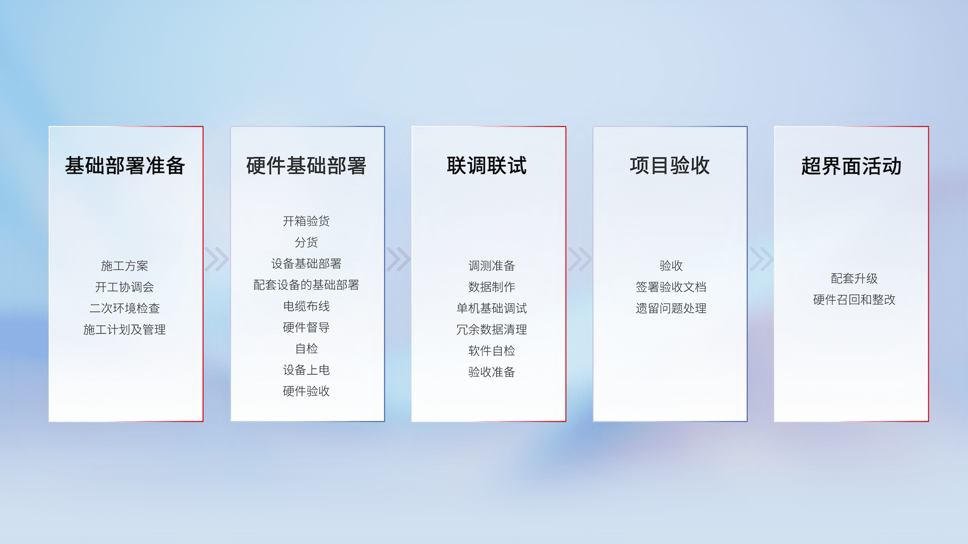 从基础部署准备、、硬件基础部署、、、联调联试、、、项目验收、、、、越界面活动的全过程可追溯,,保证施工质量和进度。。。